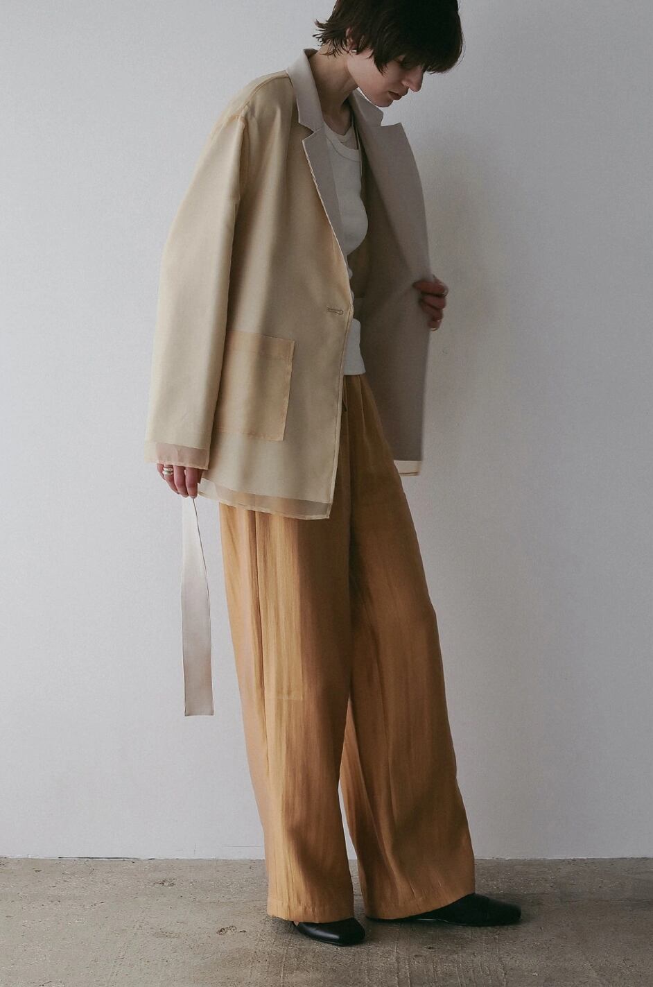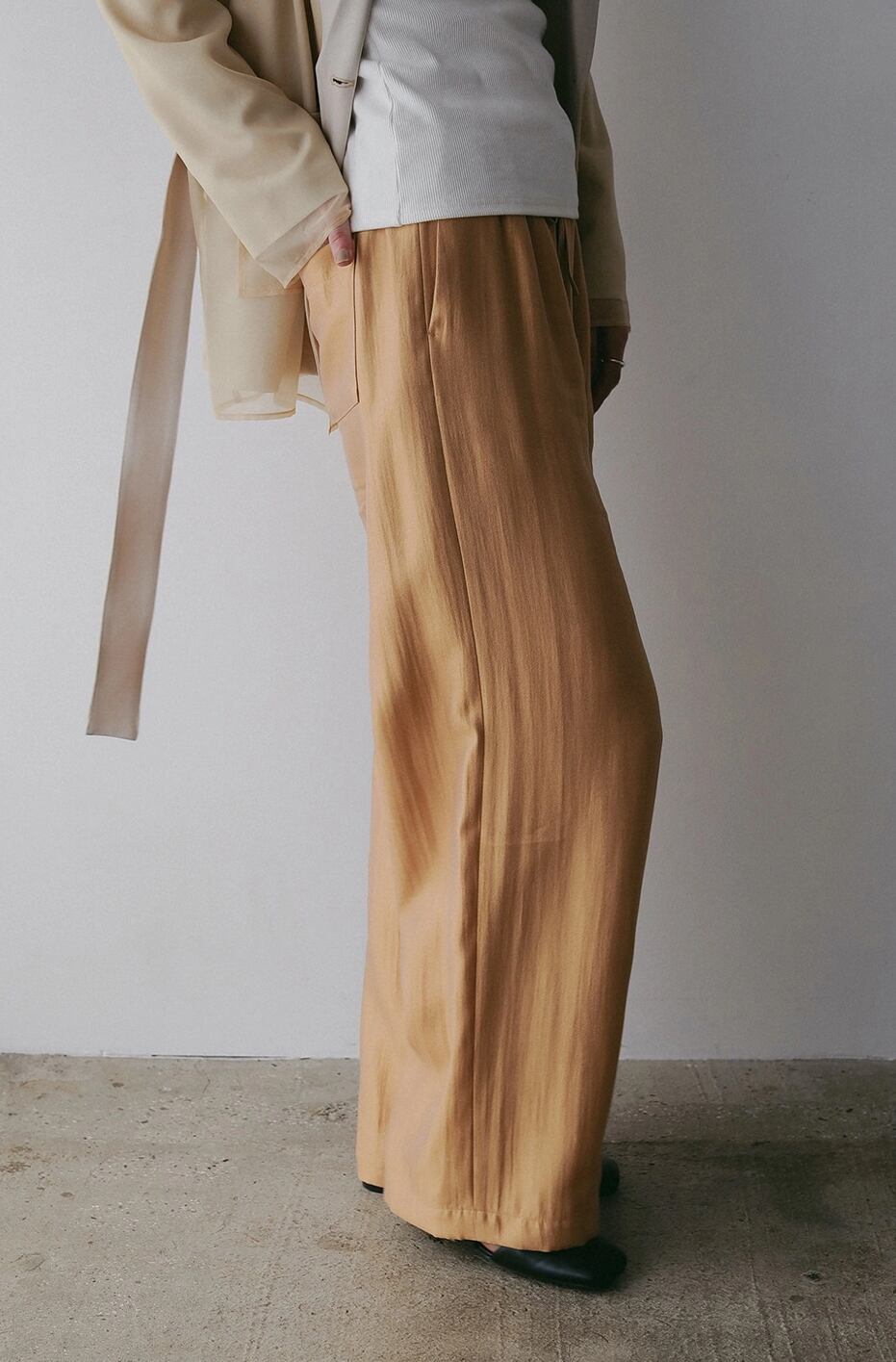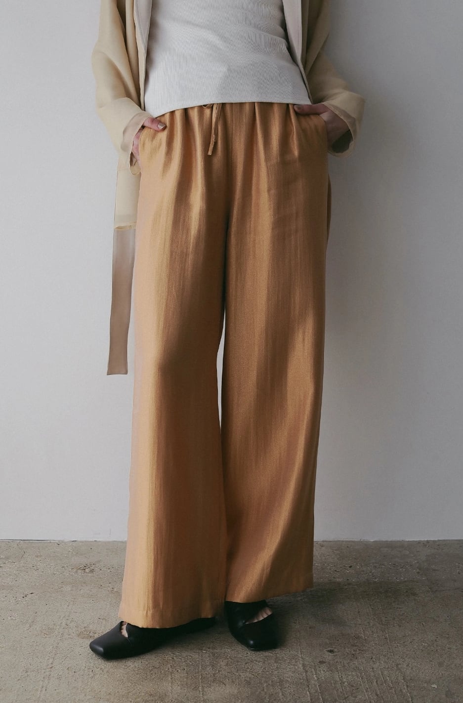 太めのシルエットにウエストのドローストリングでリラックス感がありつつ、光沢感のある素材を使用することでカジュアルになりすぎないパンツに仕上げました。