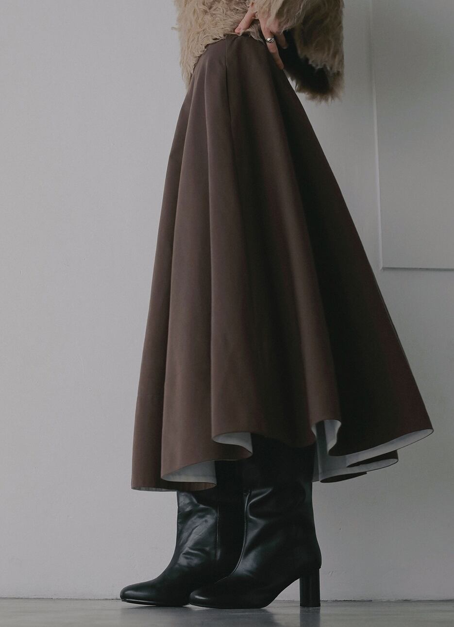 裾の内側には配色の幅広見返しをつけており、歩いたときや風に揺れた瞬間に白い裏地がちらりと見えるさりげないアクセントがポイント。一見シンプルながら、動きの中で個性のあるスカートに。