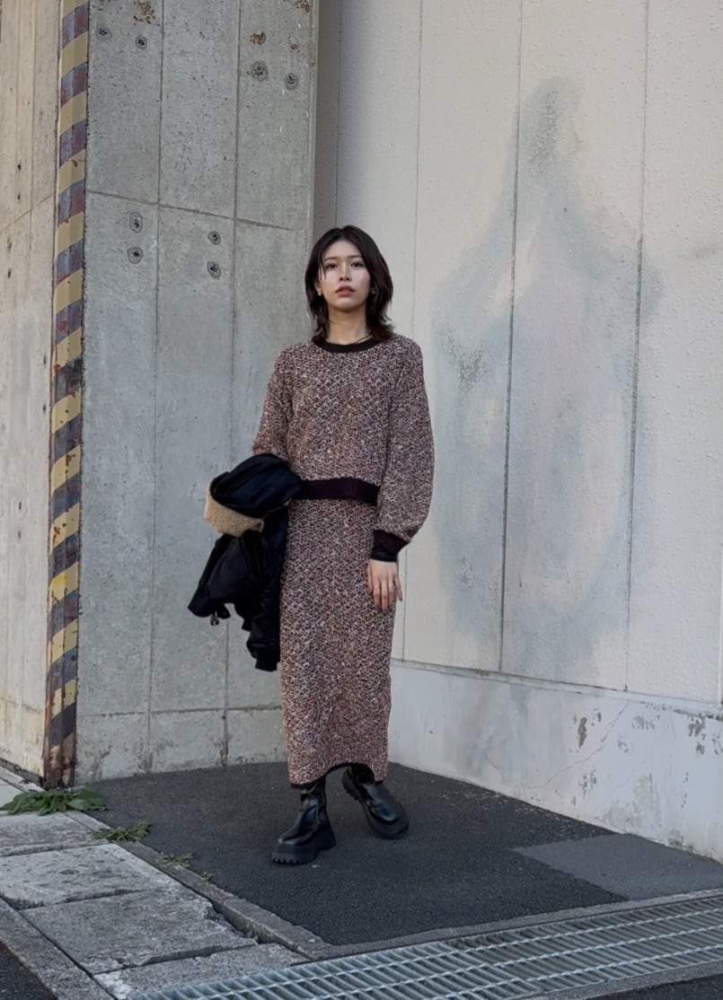 単品でももちろん、同素材のニットスカートと合わせてセットアップで着用するとオシャレ度がグッとアップするのでオススメです。