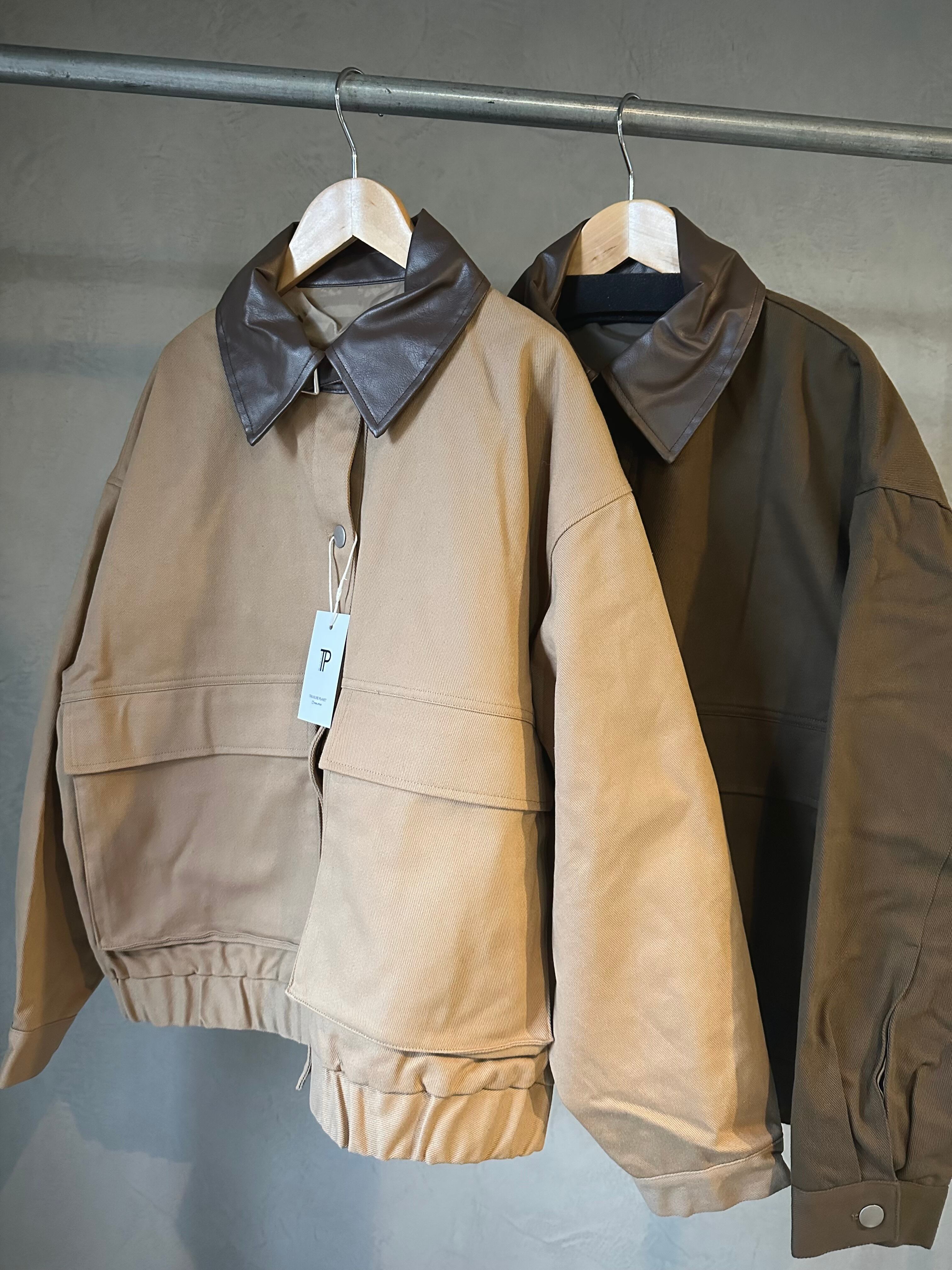 エコレザーの襟が特徴的な今季トレンドのハンティングジャケットのツイルブルゾンが入荷。