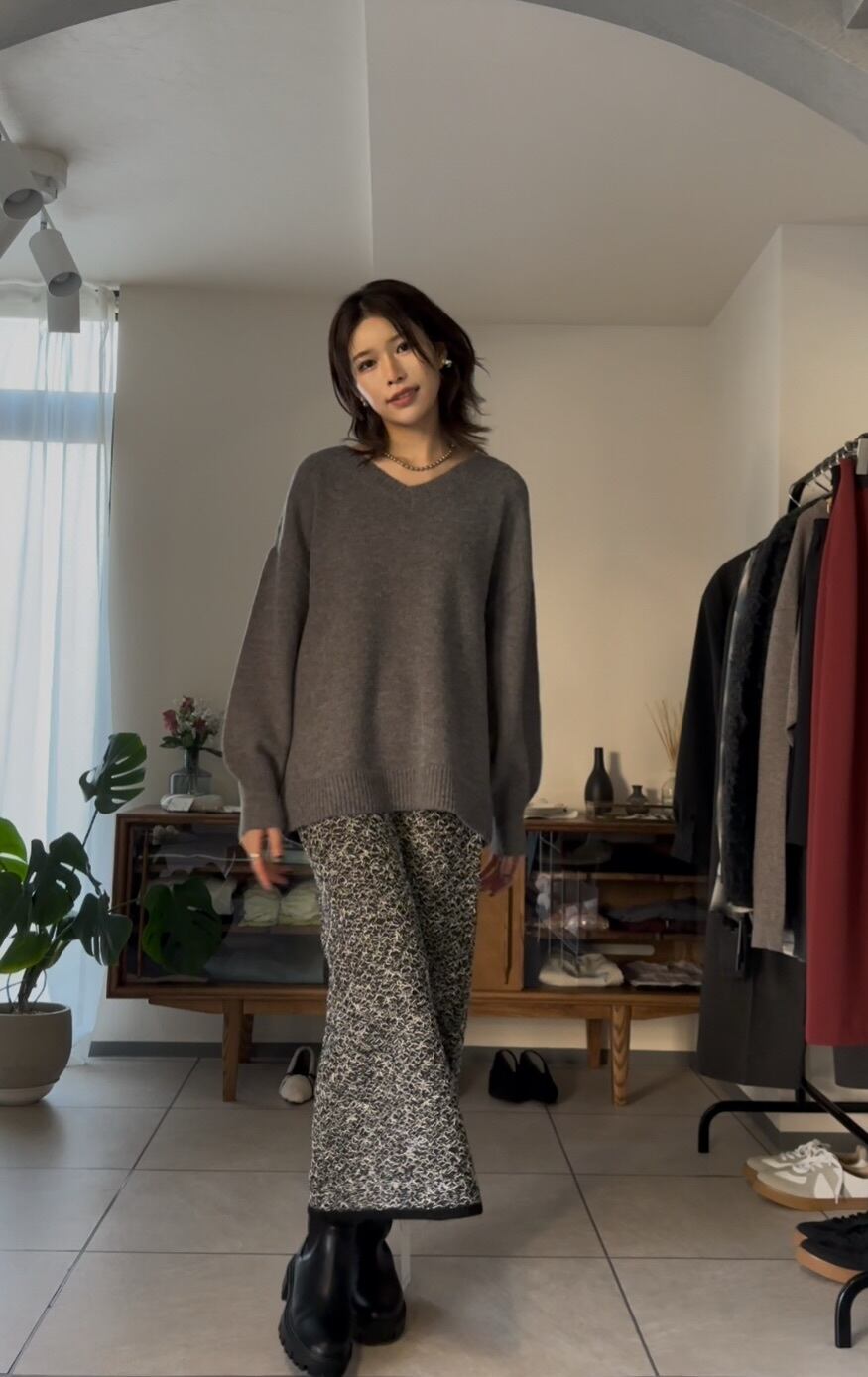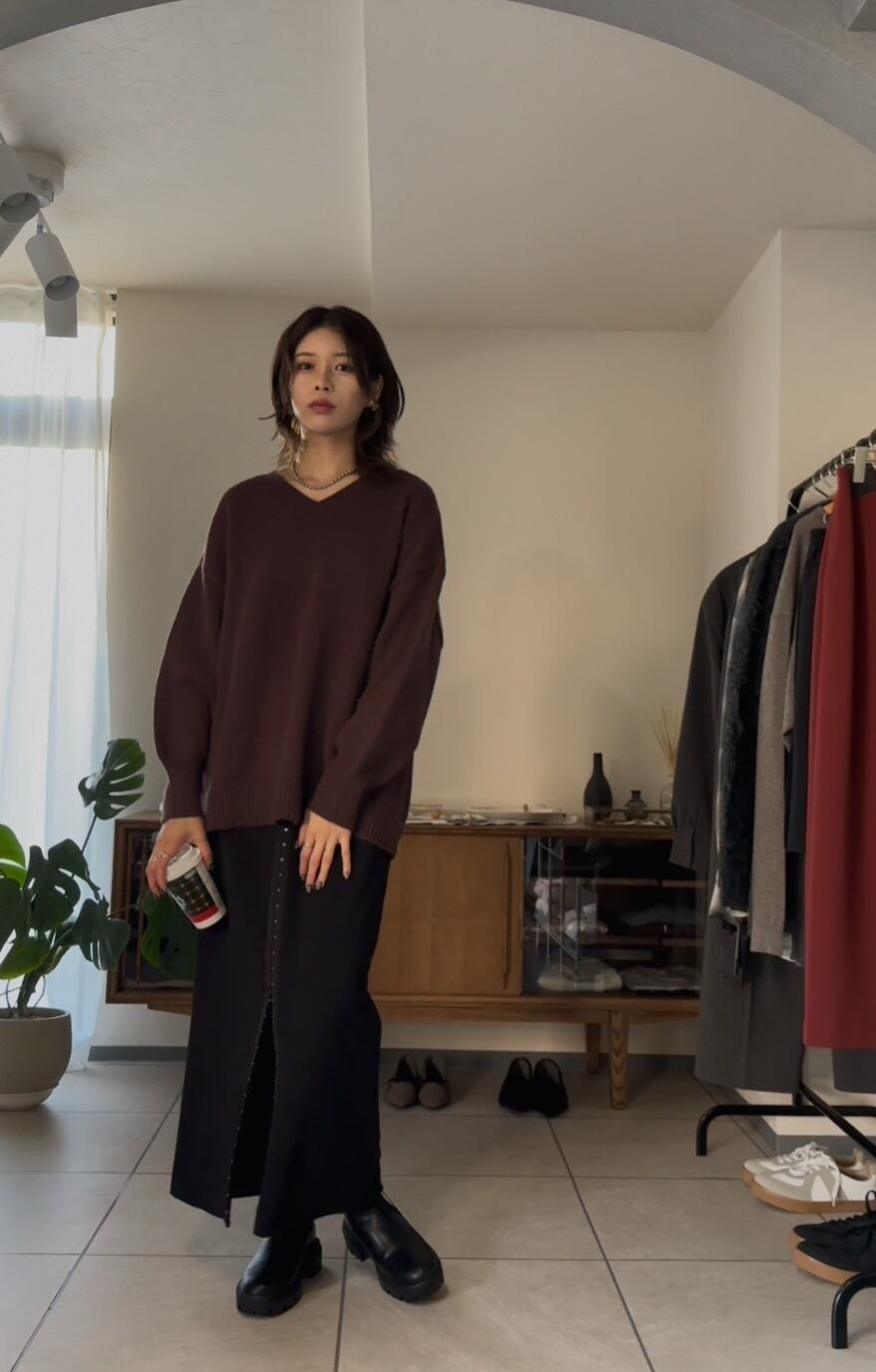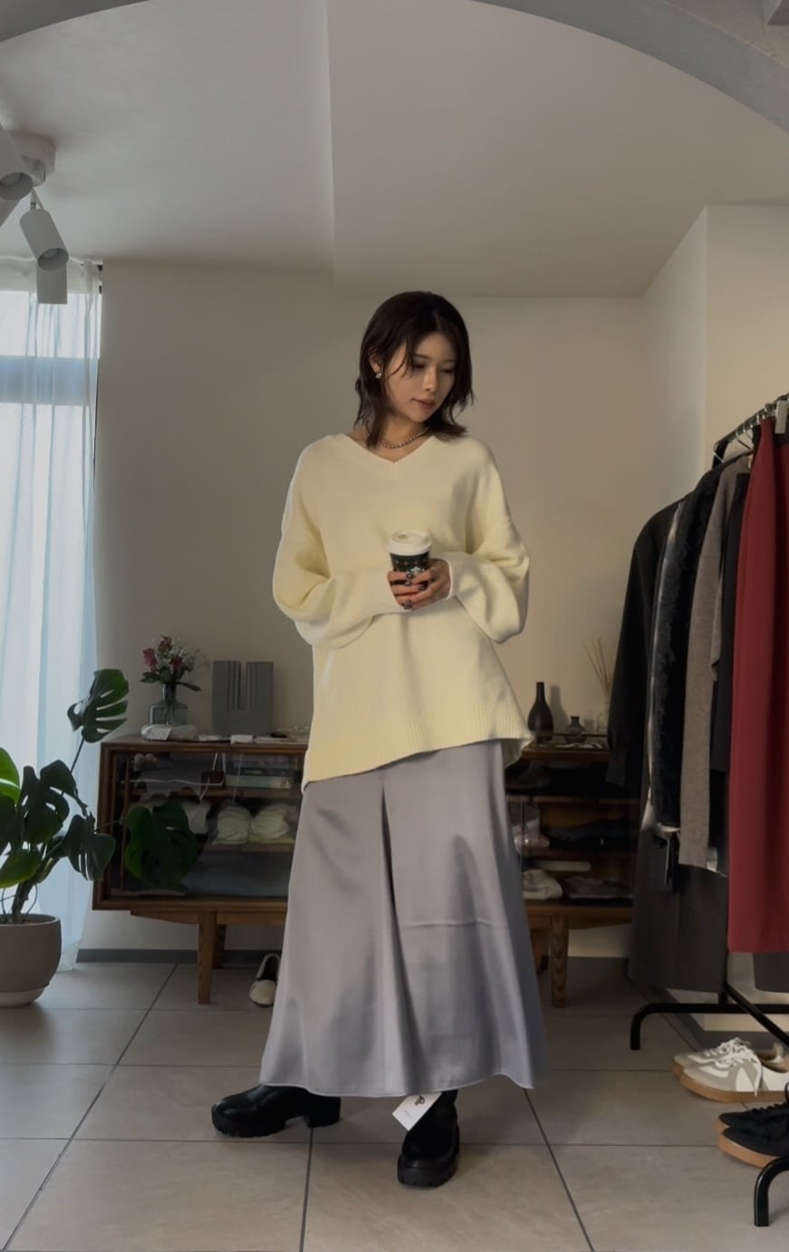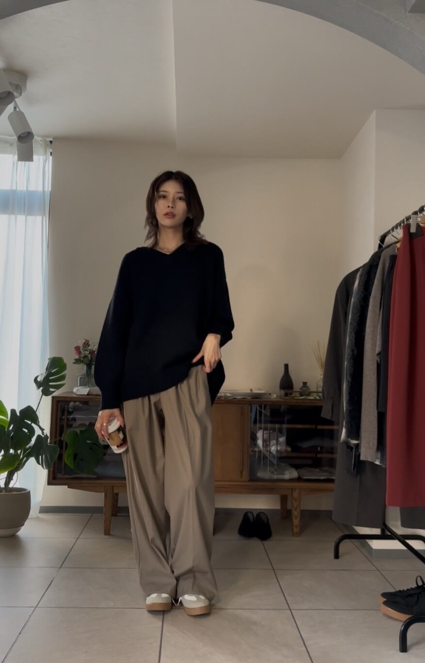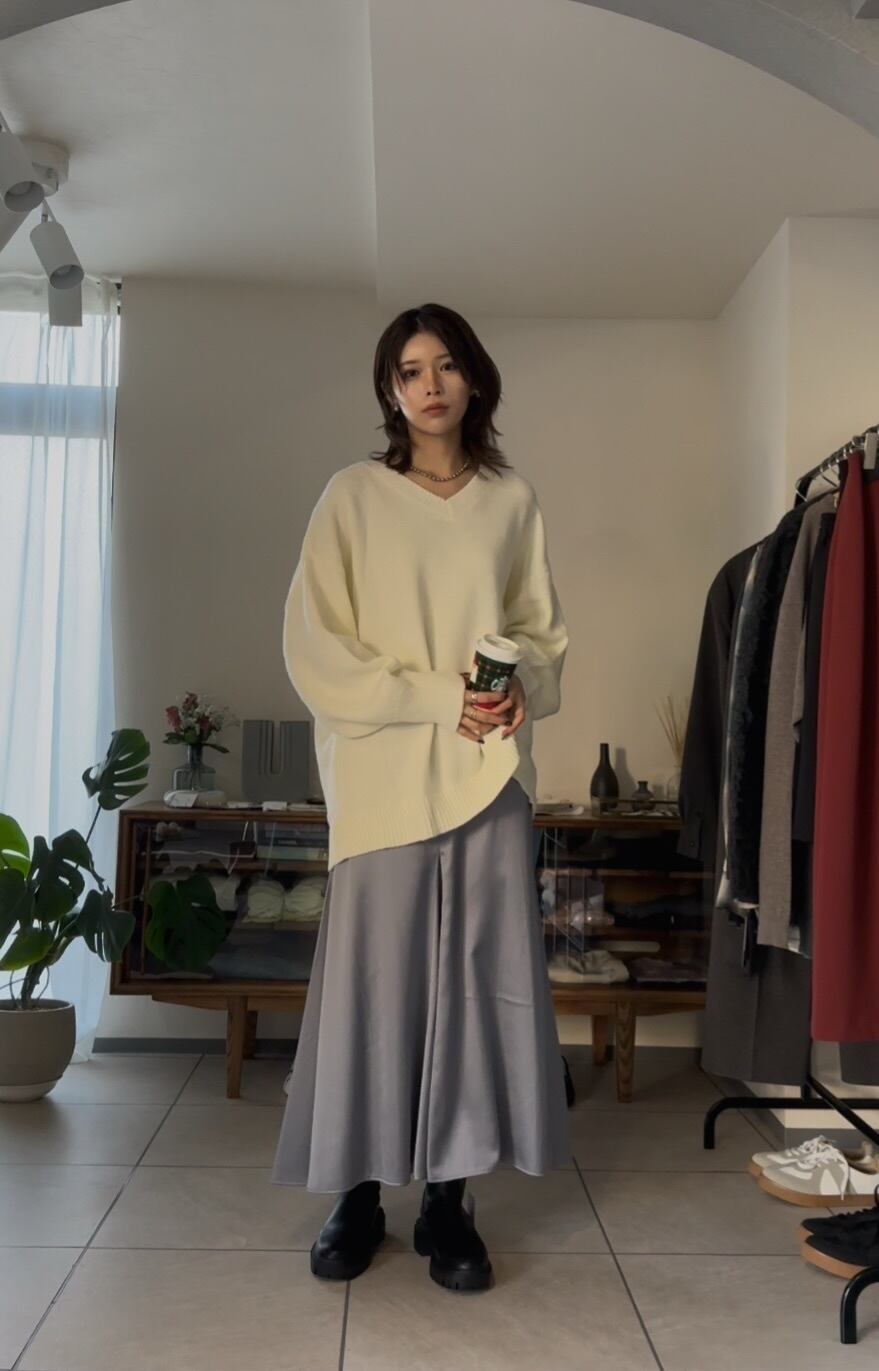 オーバーシルエットながらも、Vネックで首元をすっきりと見せてくれるので、カジュアルになりすぎず、キレイめで合わせていただけます◎