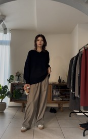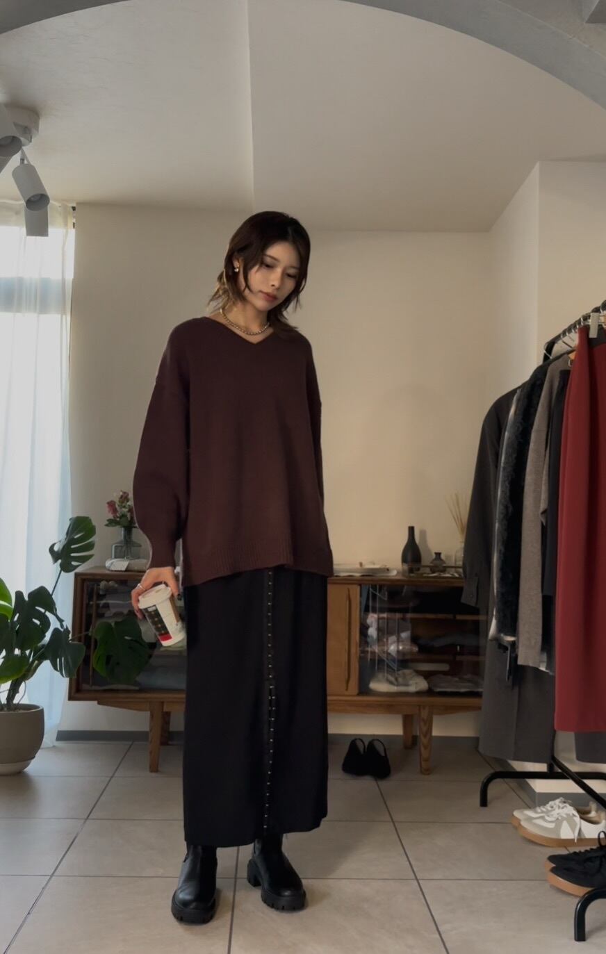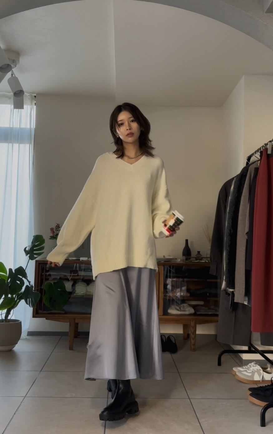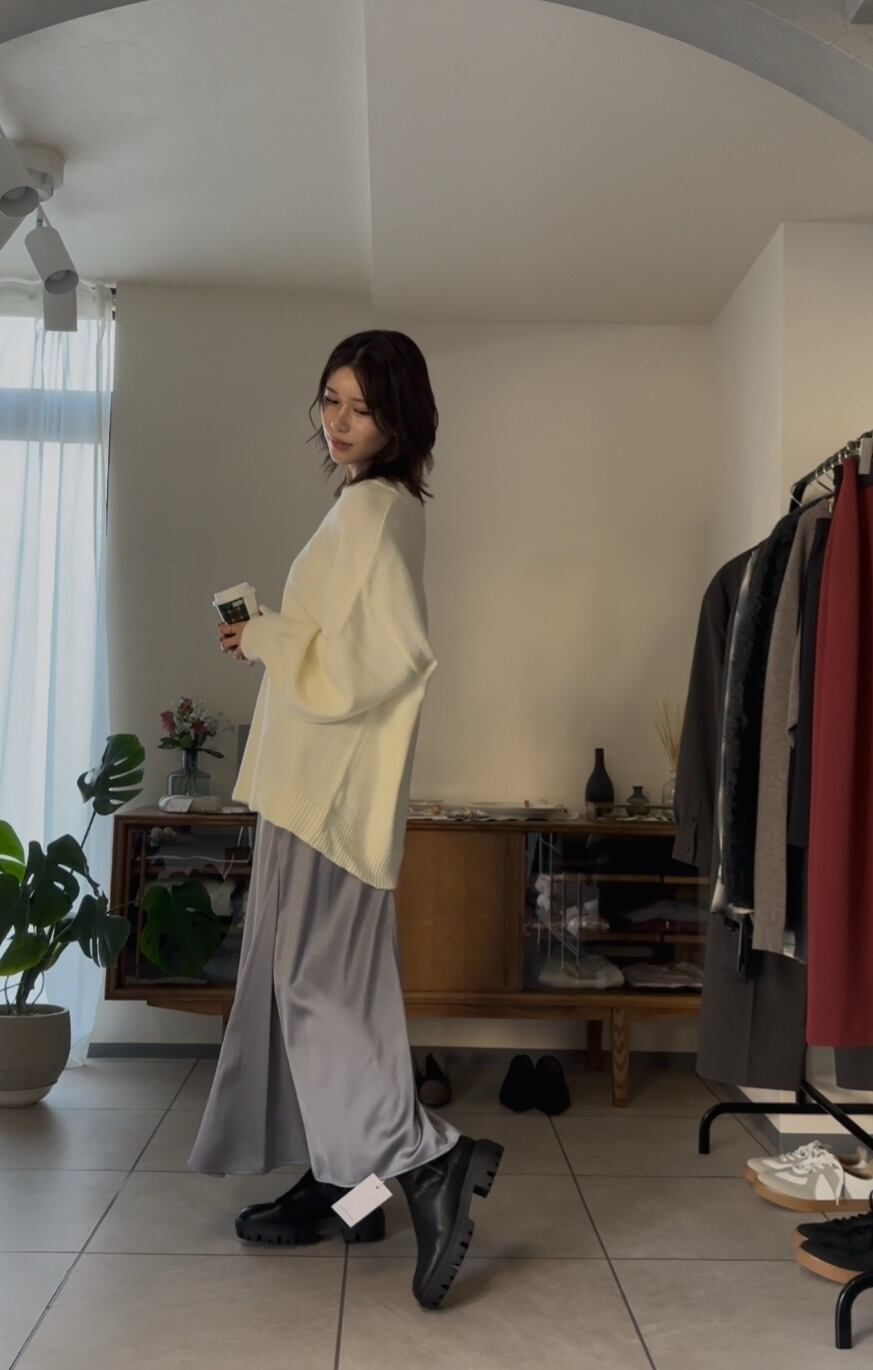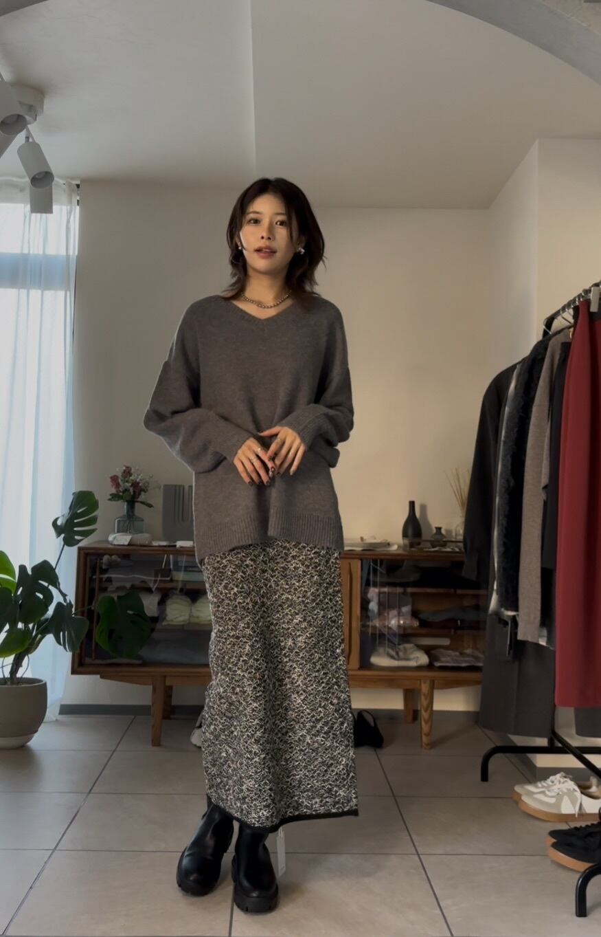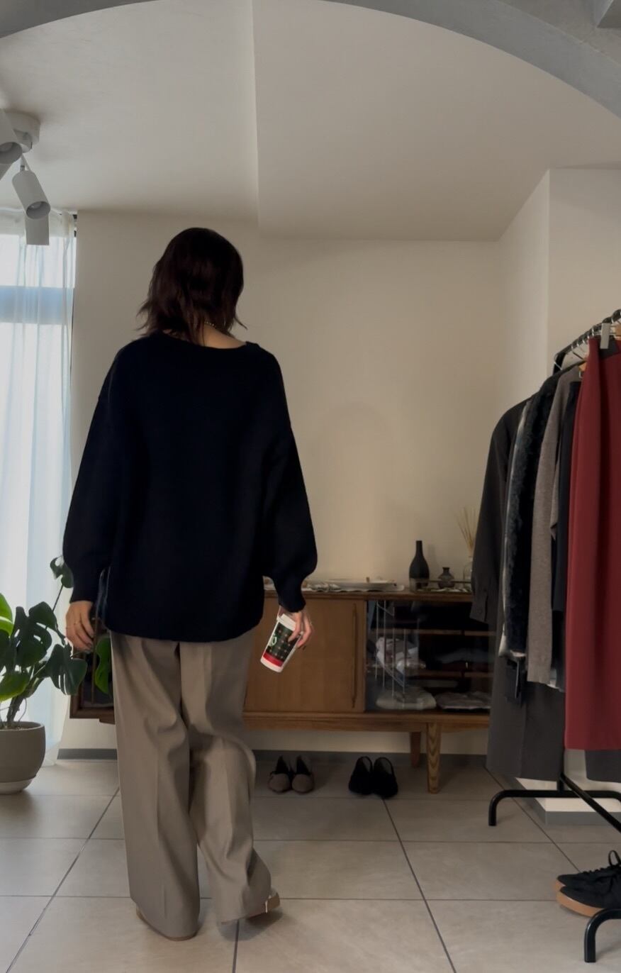 オーバーシルエットながらも、Vネックで首元をすっきりと見せてくれるので、カジュアルになりすぎず、キレイめで合わせていただけます◎