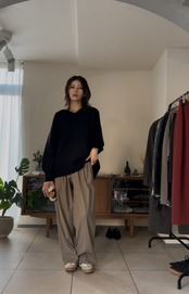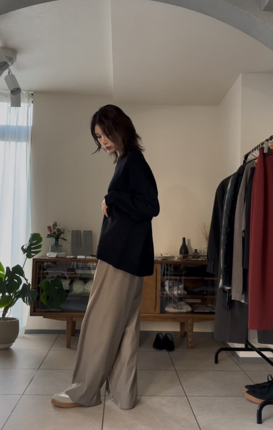 画像の様に、パンツでもスカートでも合わせやすいので、デイリーに使いやすい万能ニットとして、この冬のワードローブに押さえておきたいおすすめアイテムです。