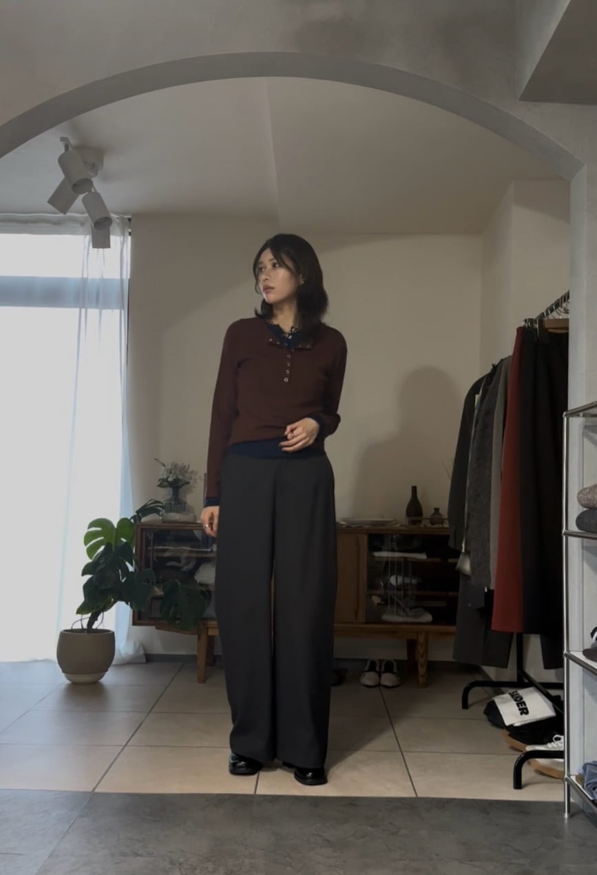 レーヨン混のしっとり滑らかな肌触りのヘンリーネックレイヤードニット。