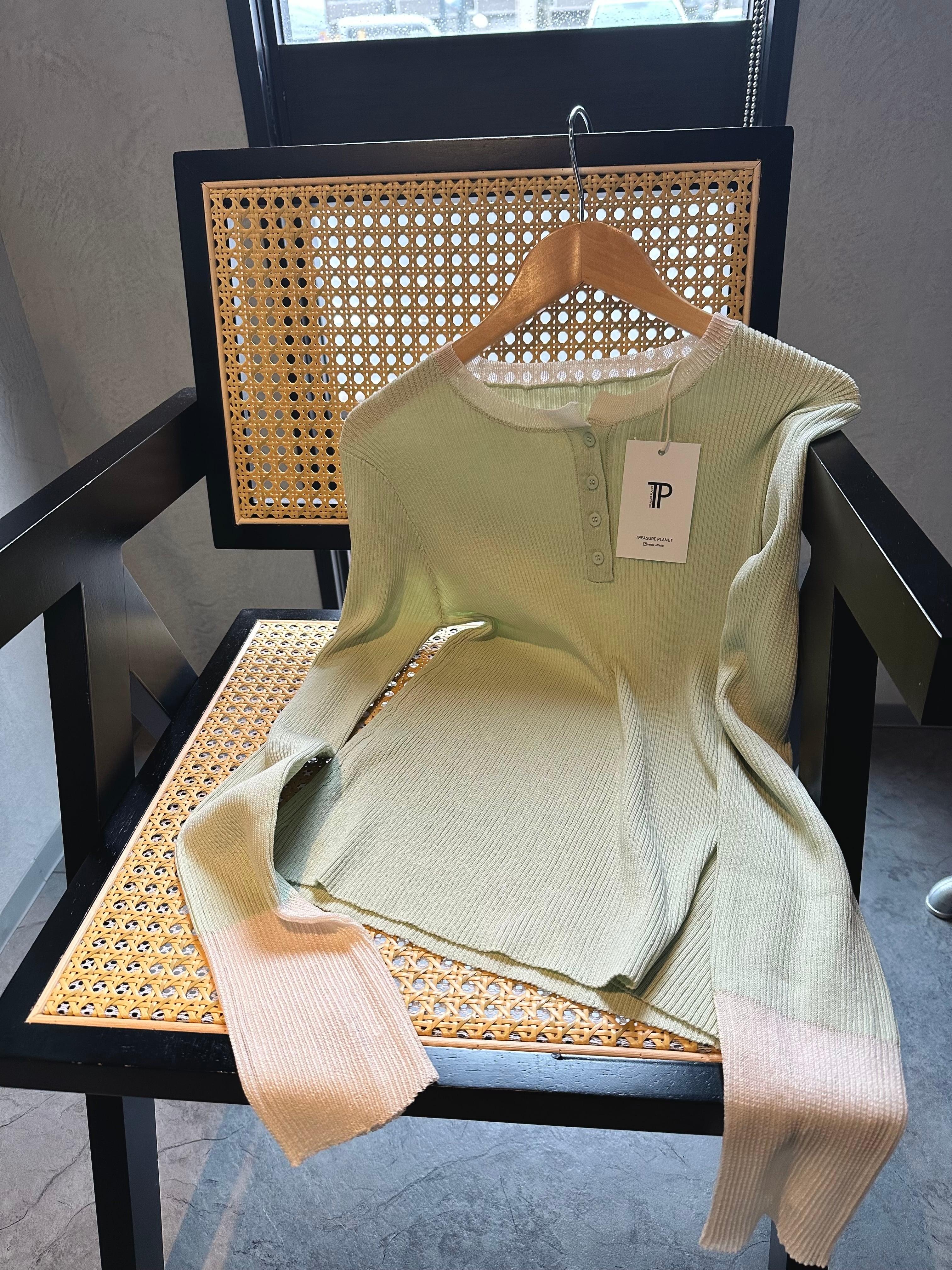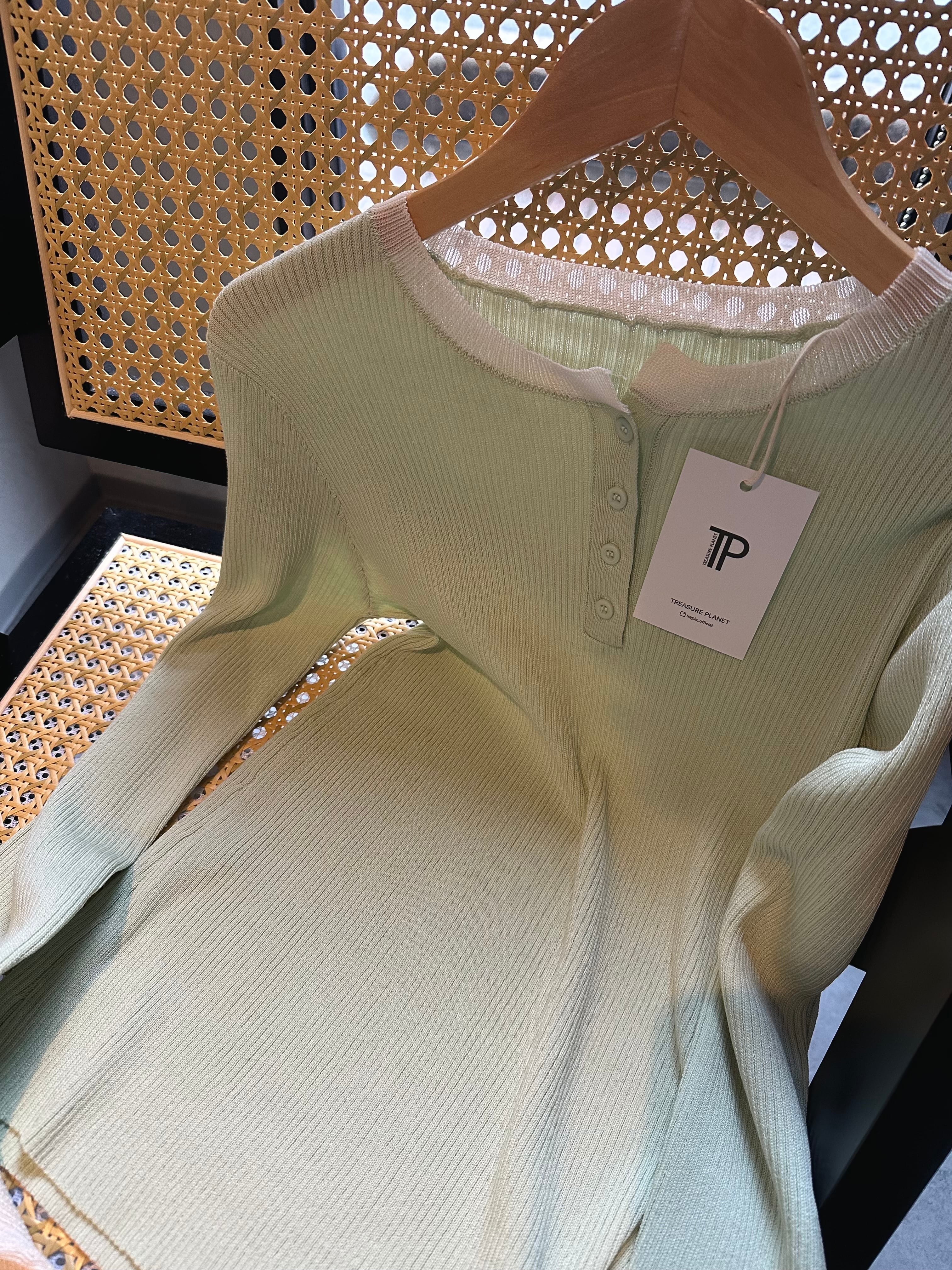 伸縮性のある薄手のリブニット素材で、ストレスフリーな着心地。