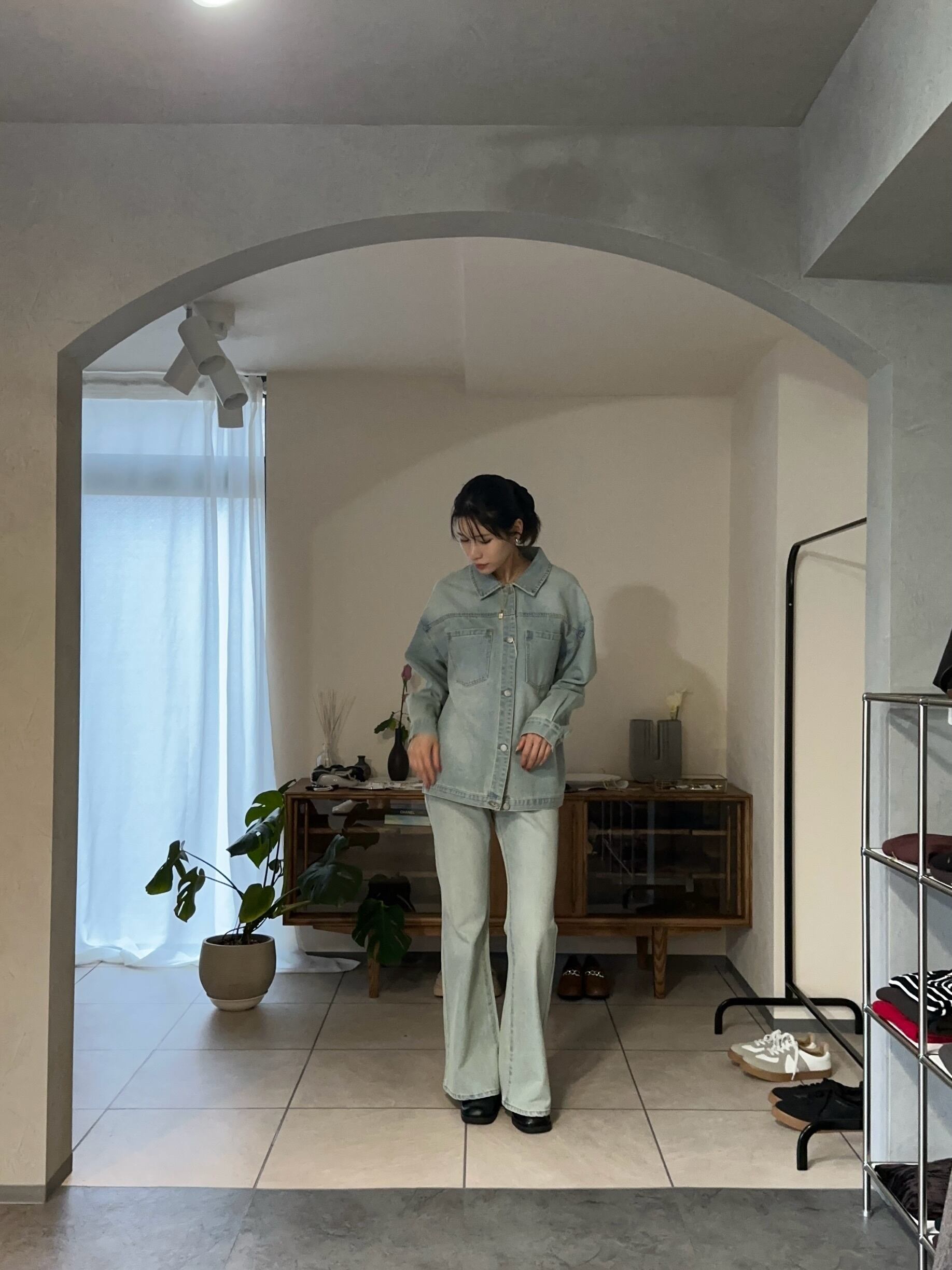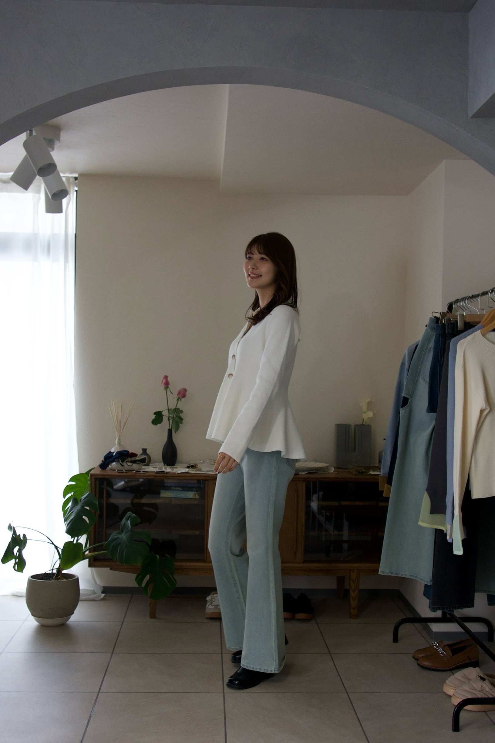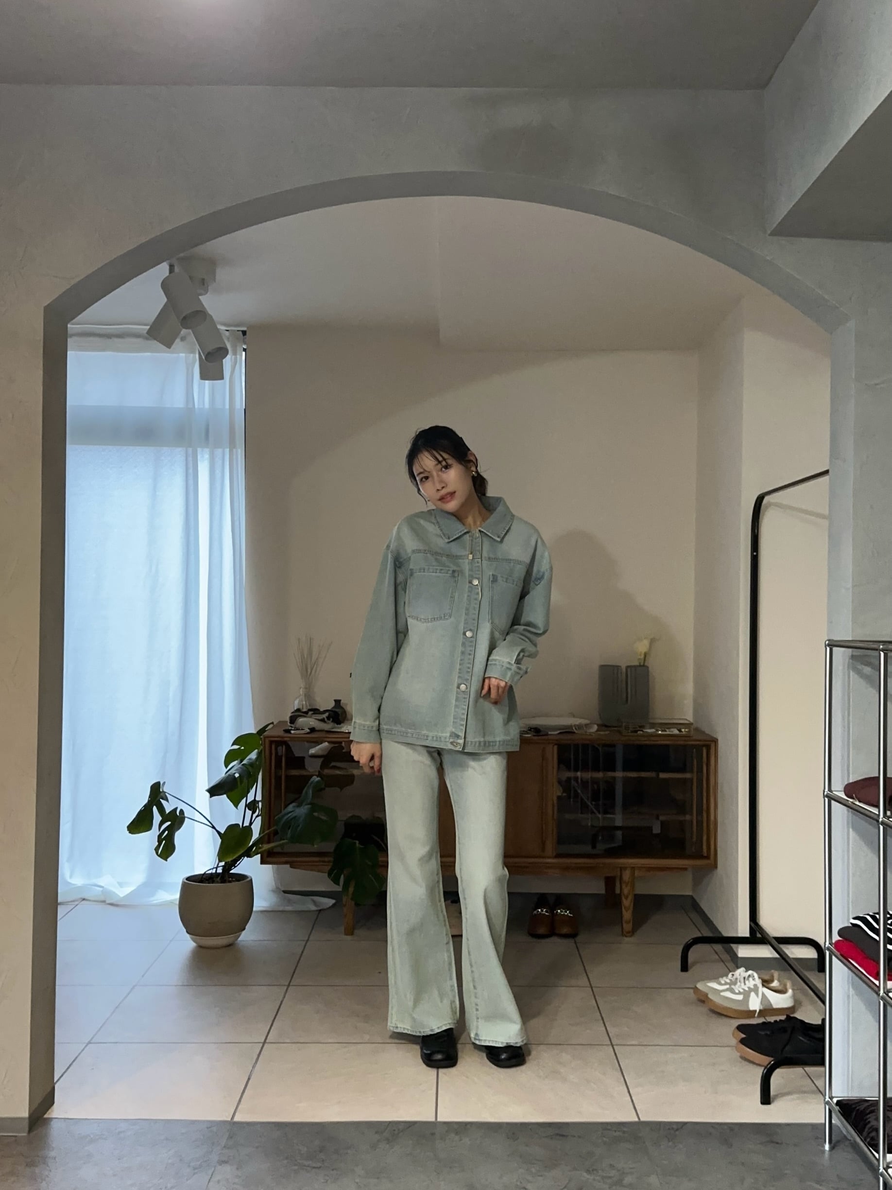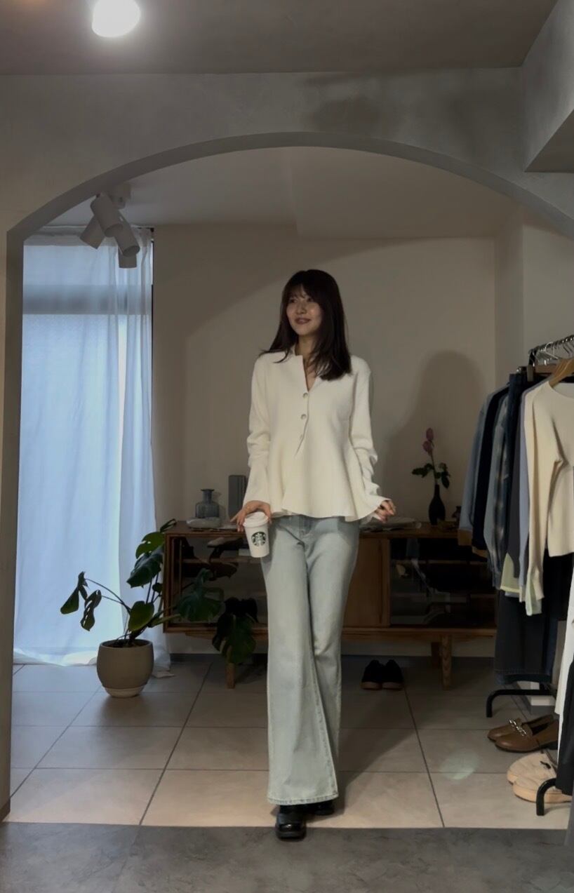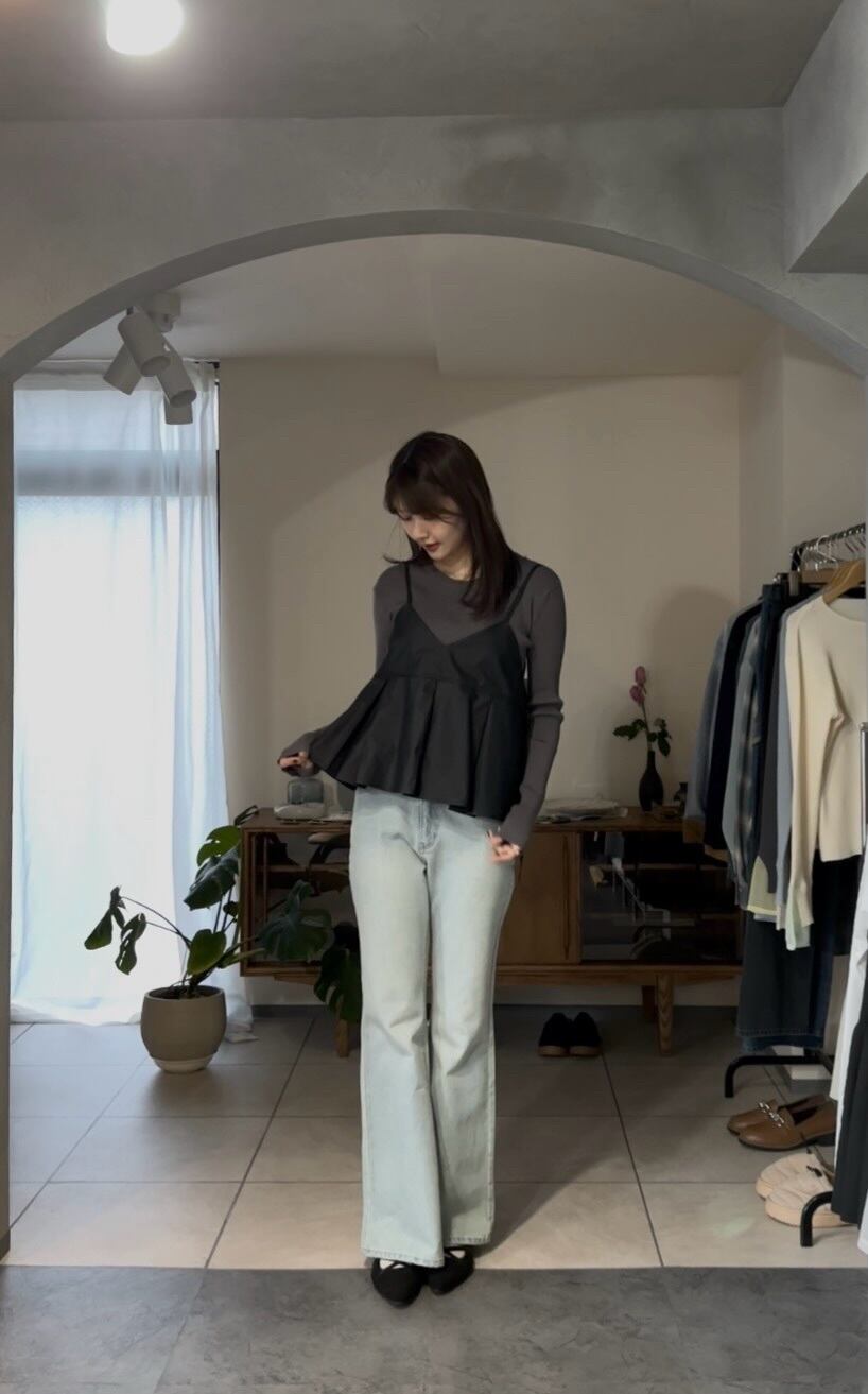 スッキリとしたシルエットなので、コンパクトなトップスはもちろん、トレンドのオーバーサイズ、ペプラムシルエットのトップスとも好相性なデニムパンツです。