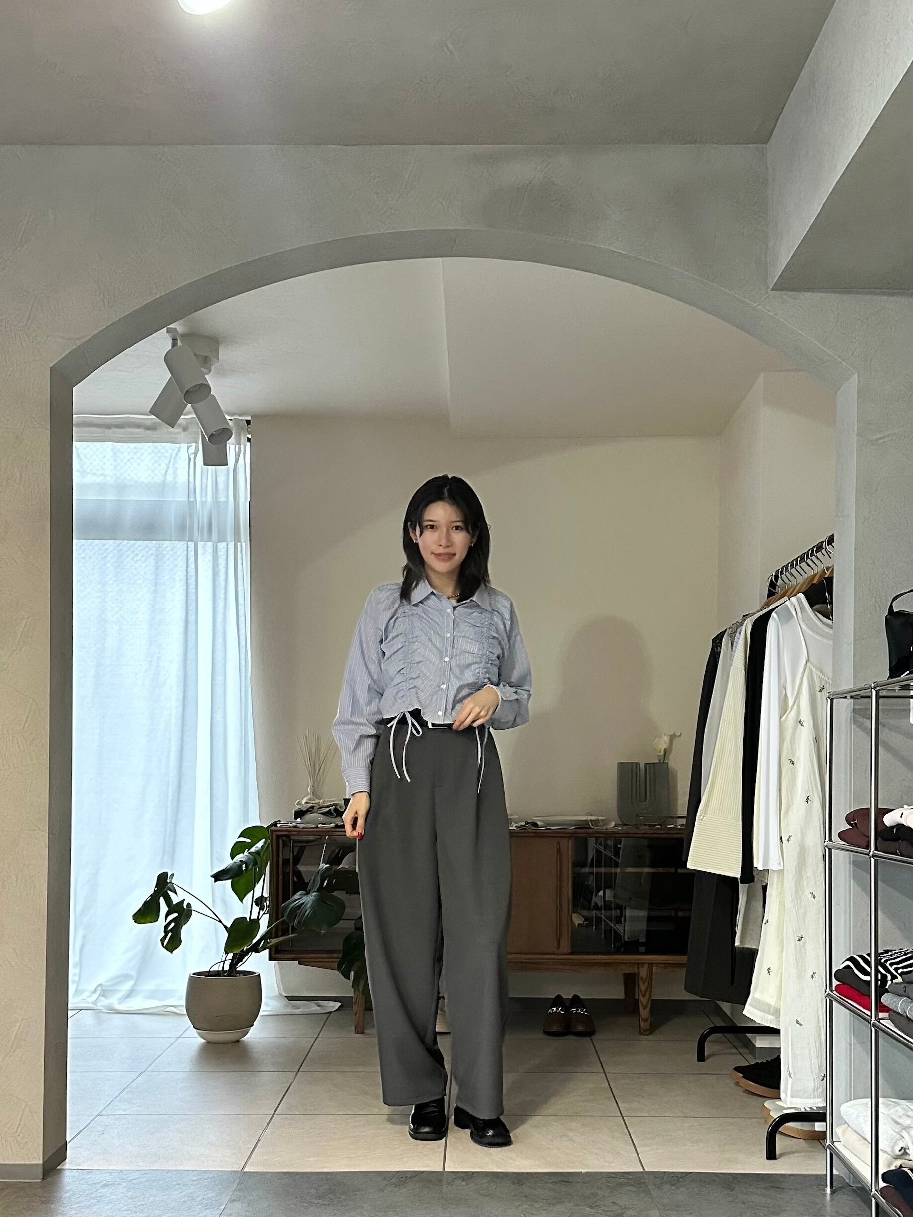 フロントのシャーリングデザインが目を惹くショート丈シャツ。