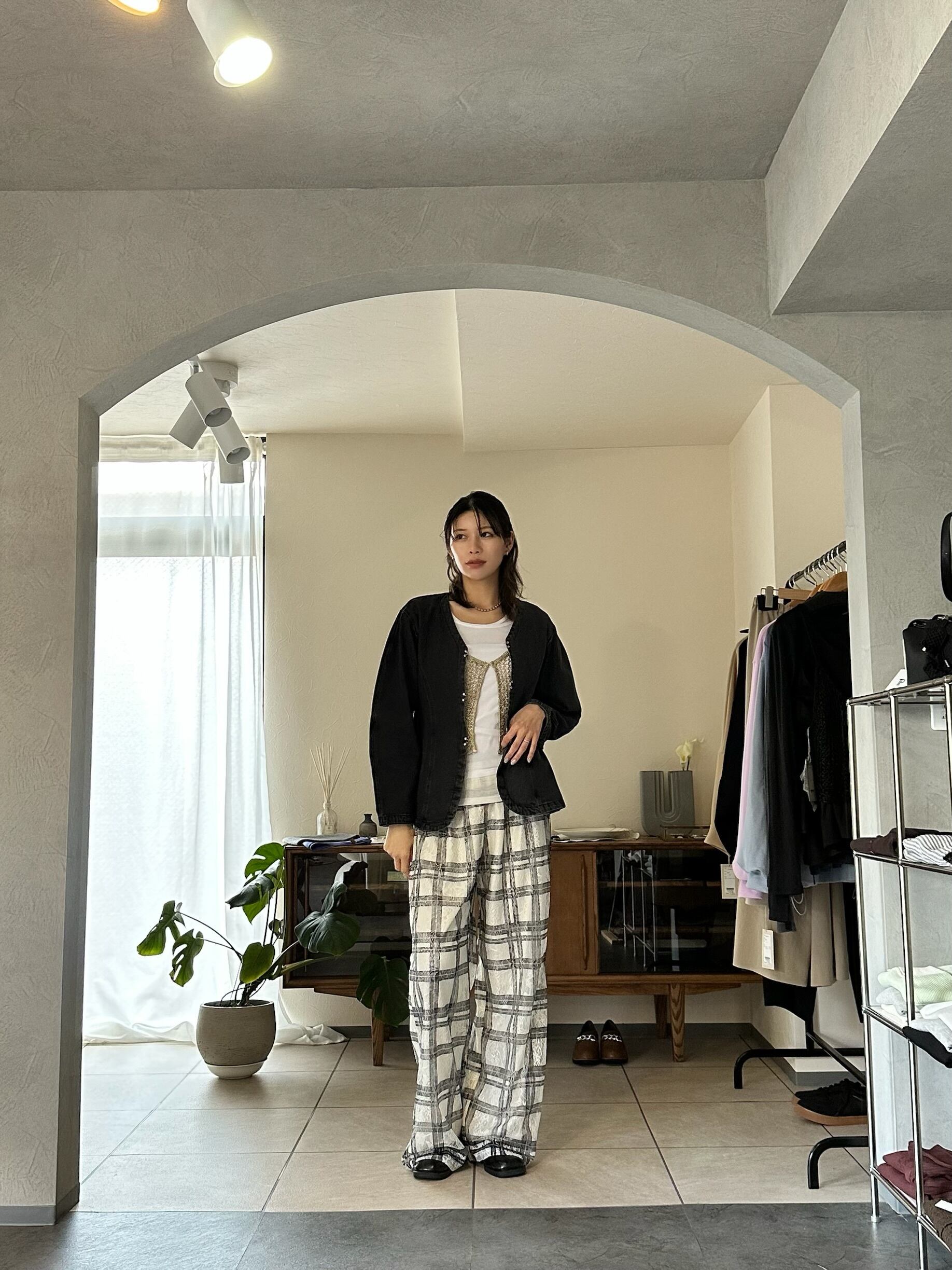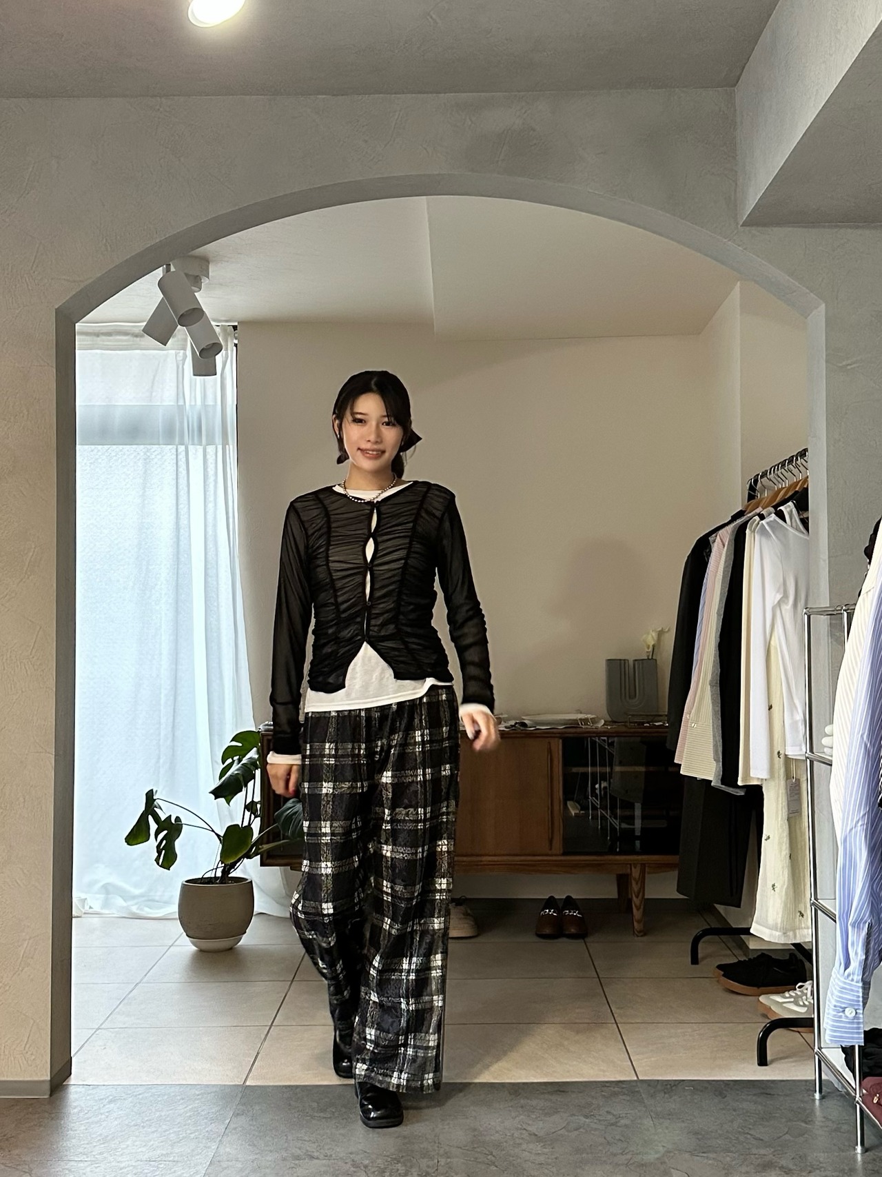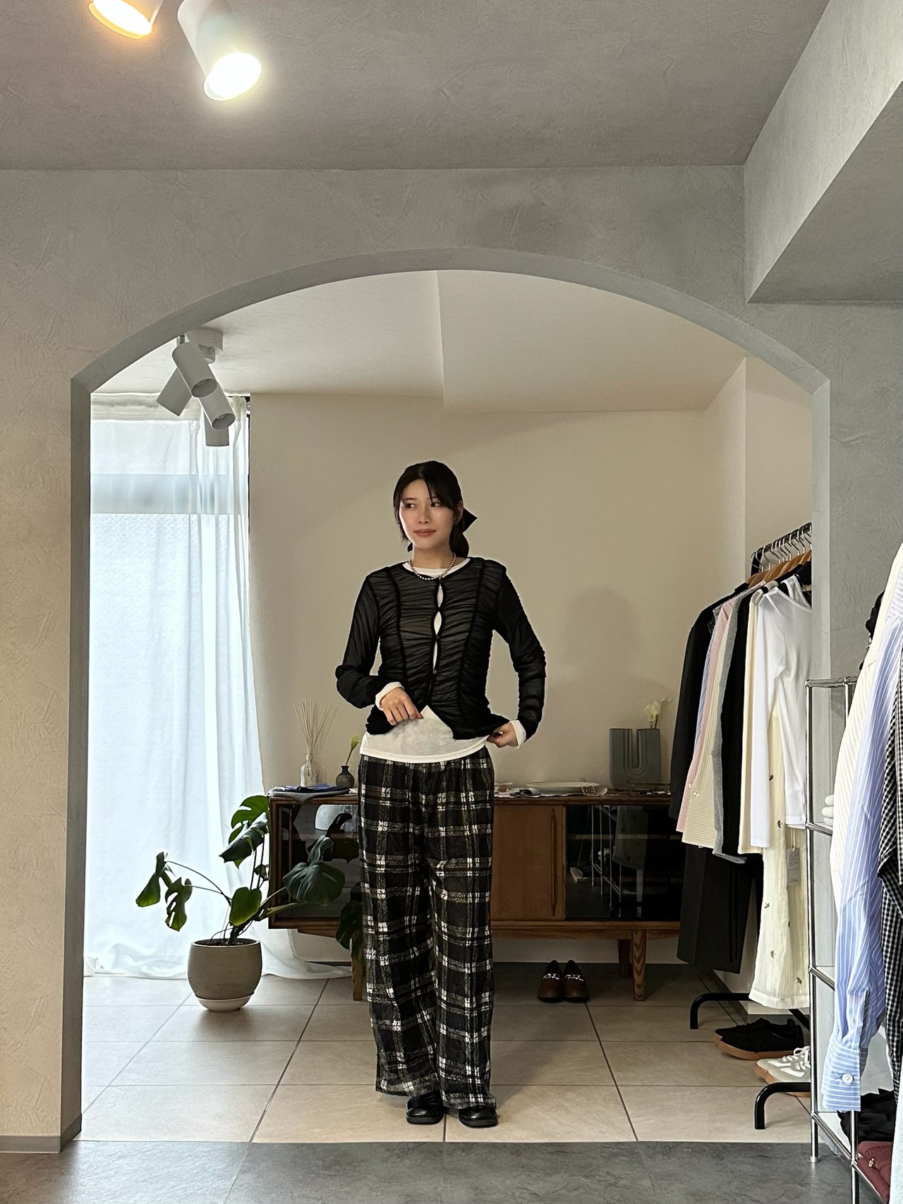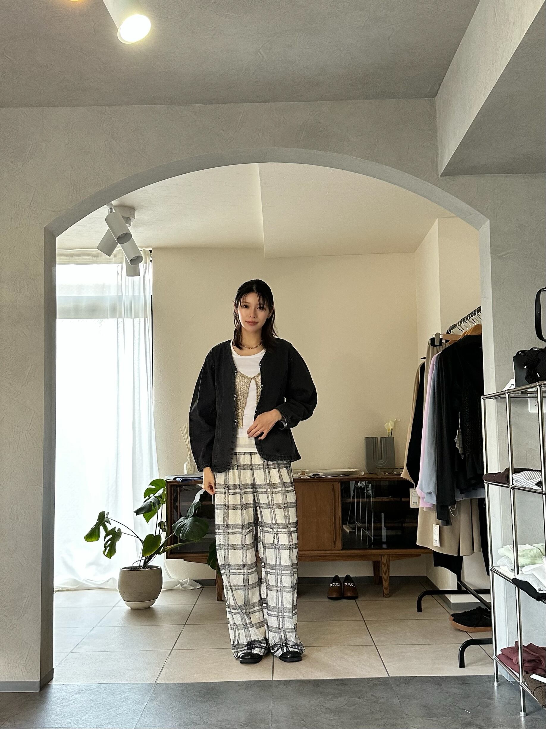 レースの軽やかな透け感にチェックをプラスし、春に向けてシーズンムードを高めてくれる一枚です。