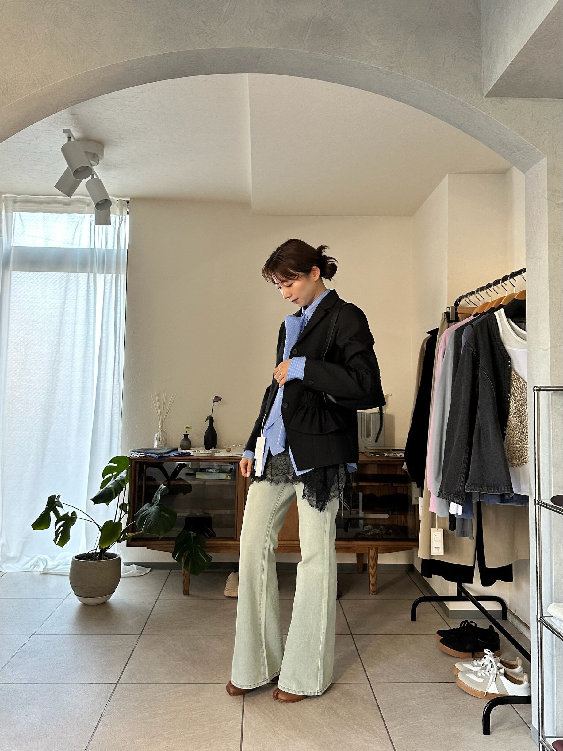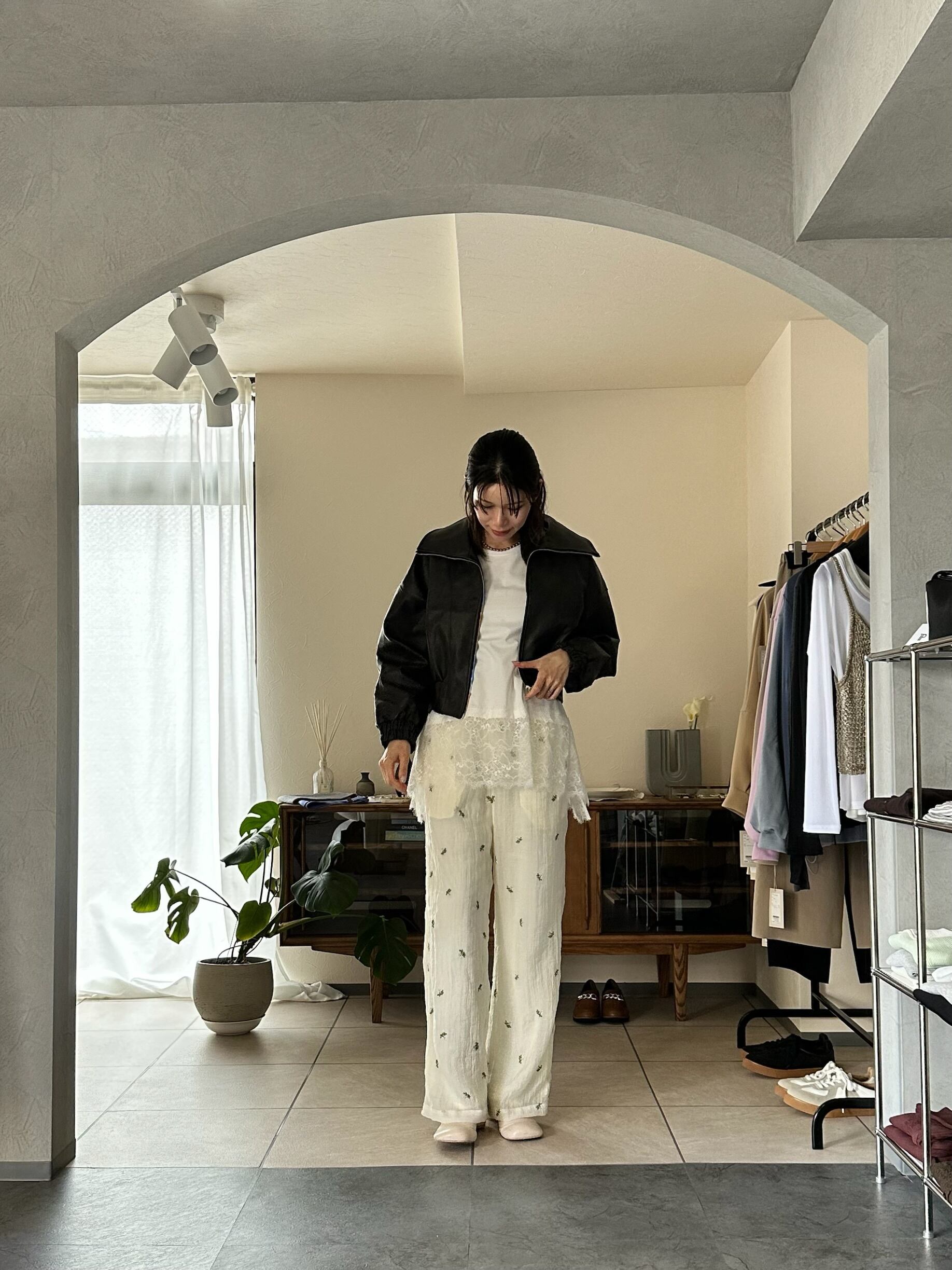 ワイドパンツやデニムと合わせてカジュアルダウンするのも◎