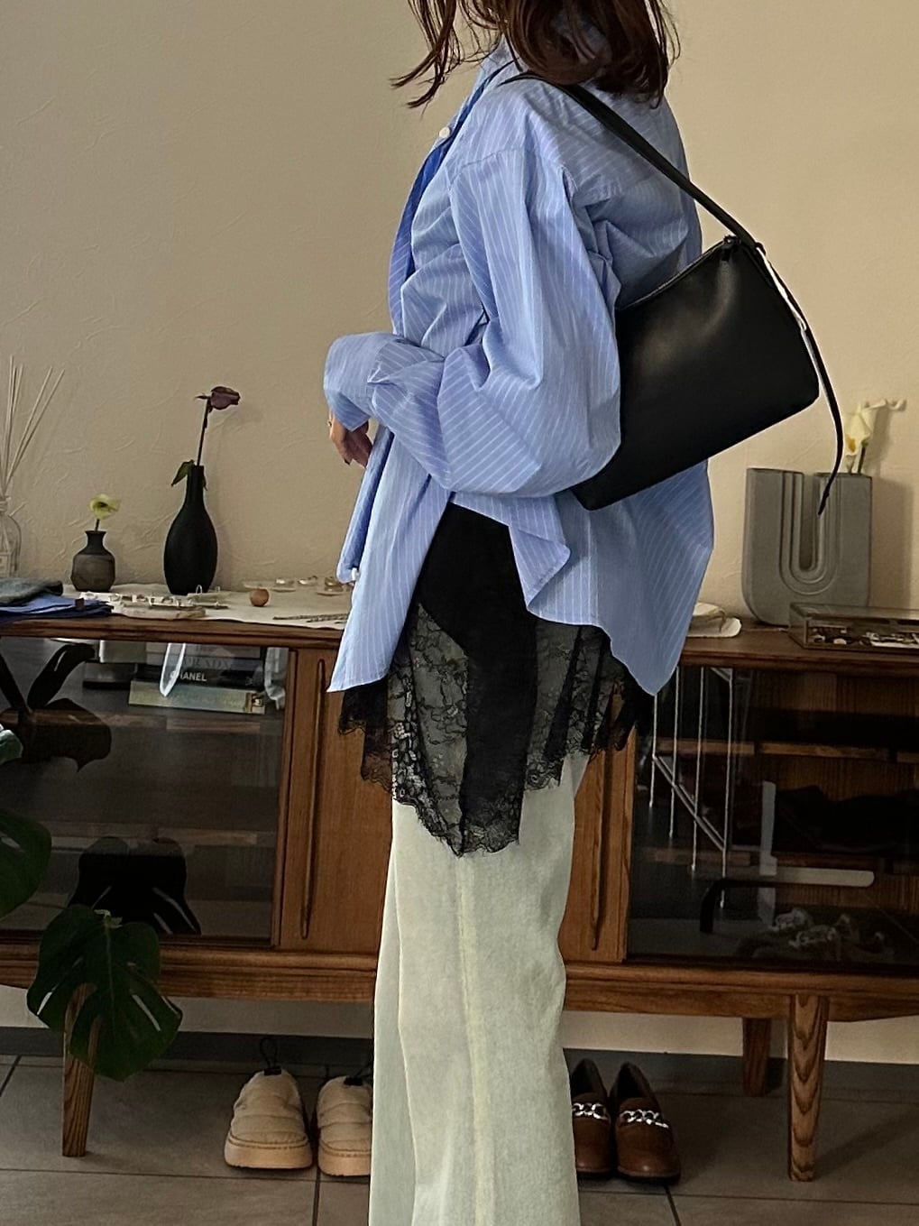 シャツやシアートップスのインナーとして裾レースをのぞかせるレイヤードスタイルも楽しめます。