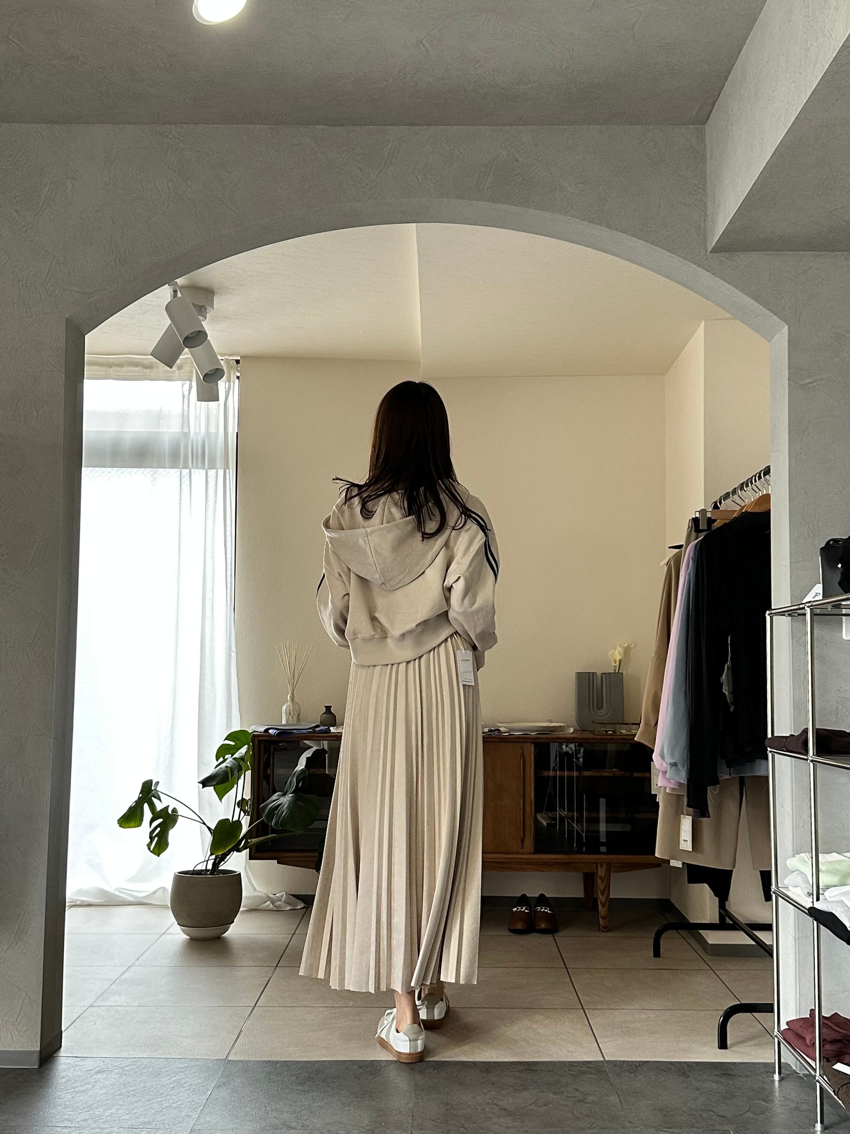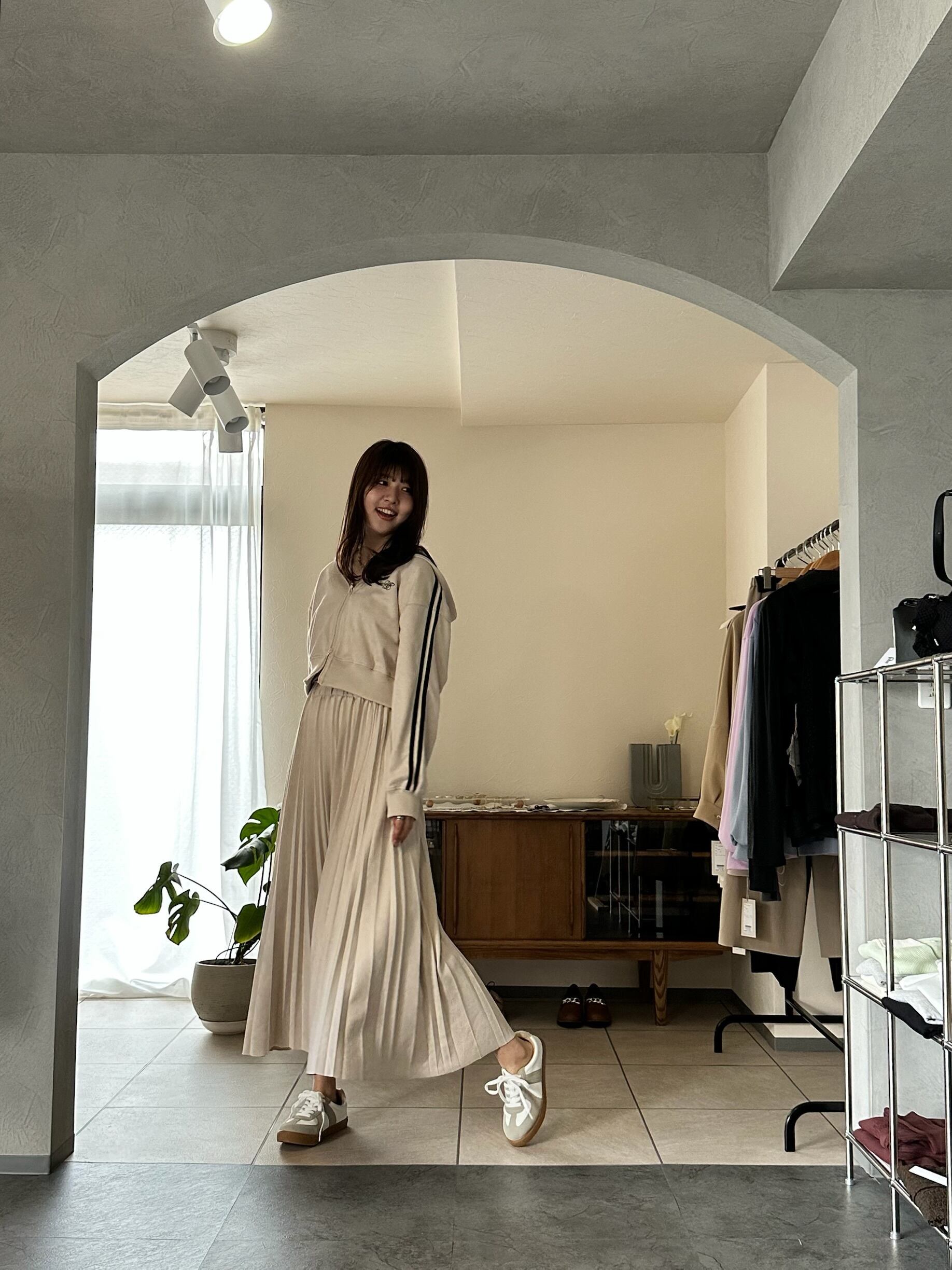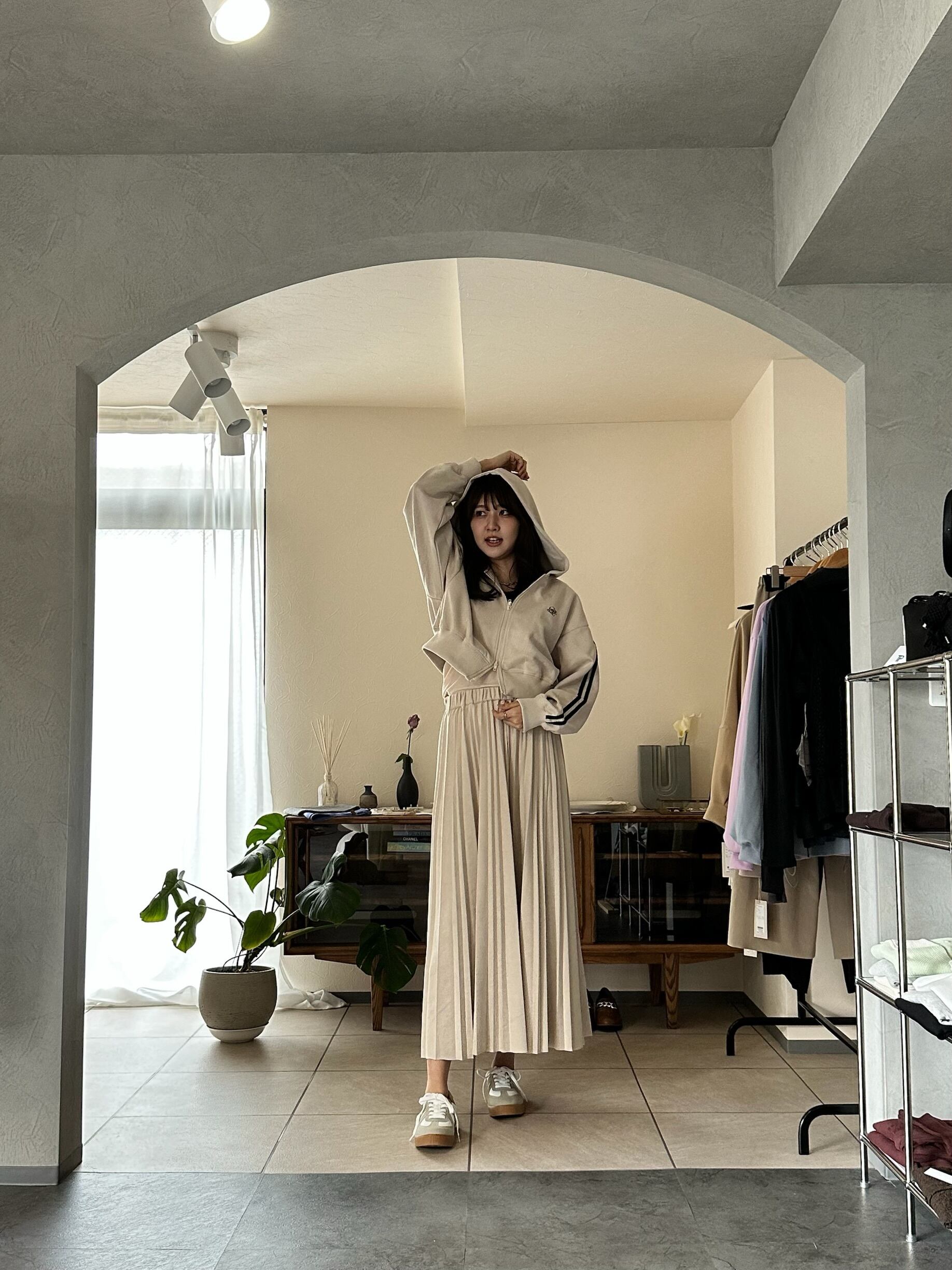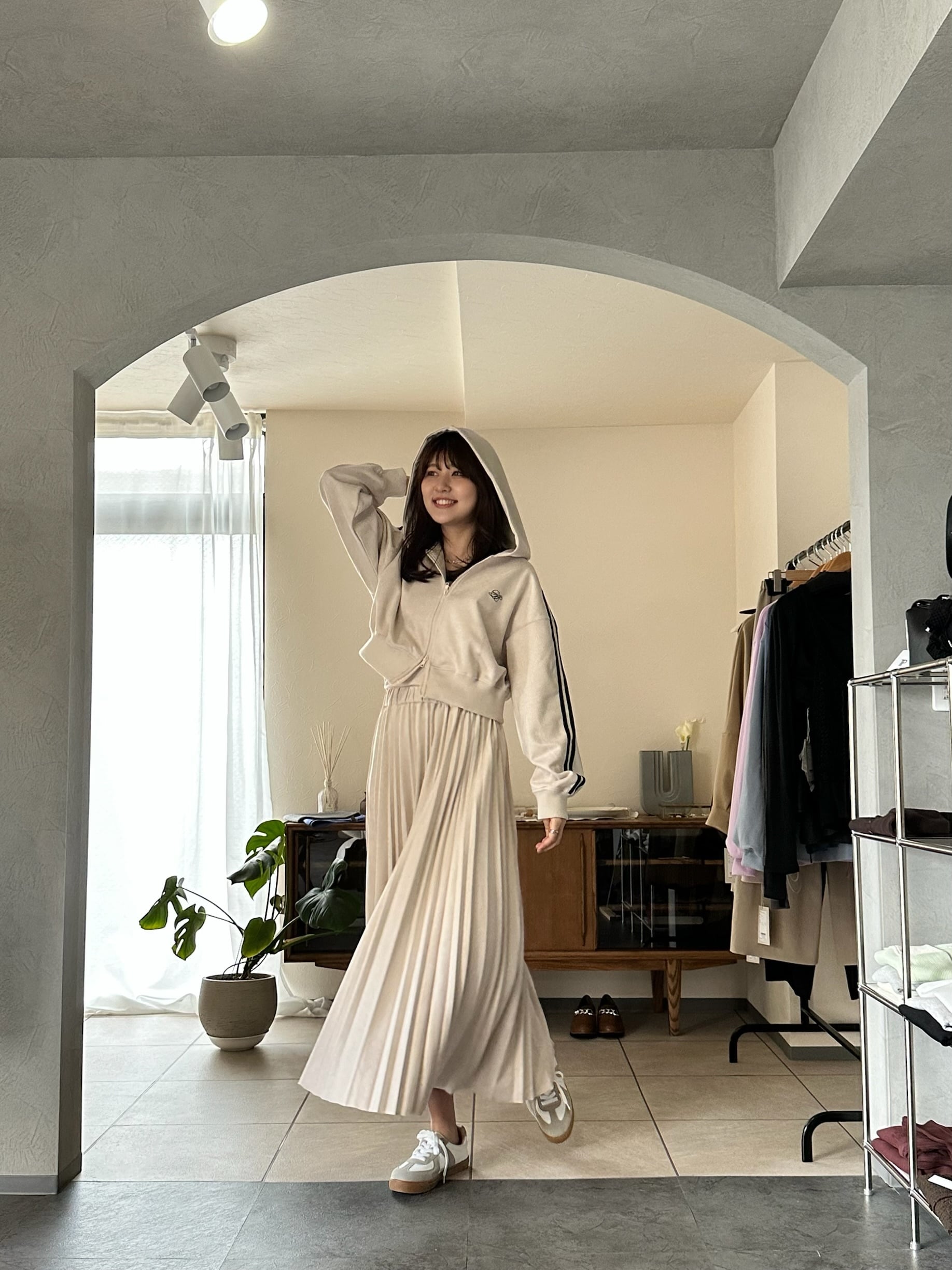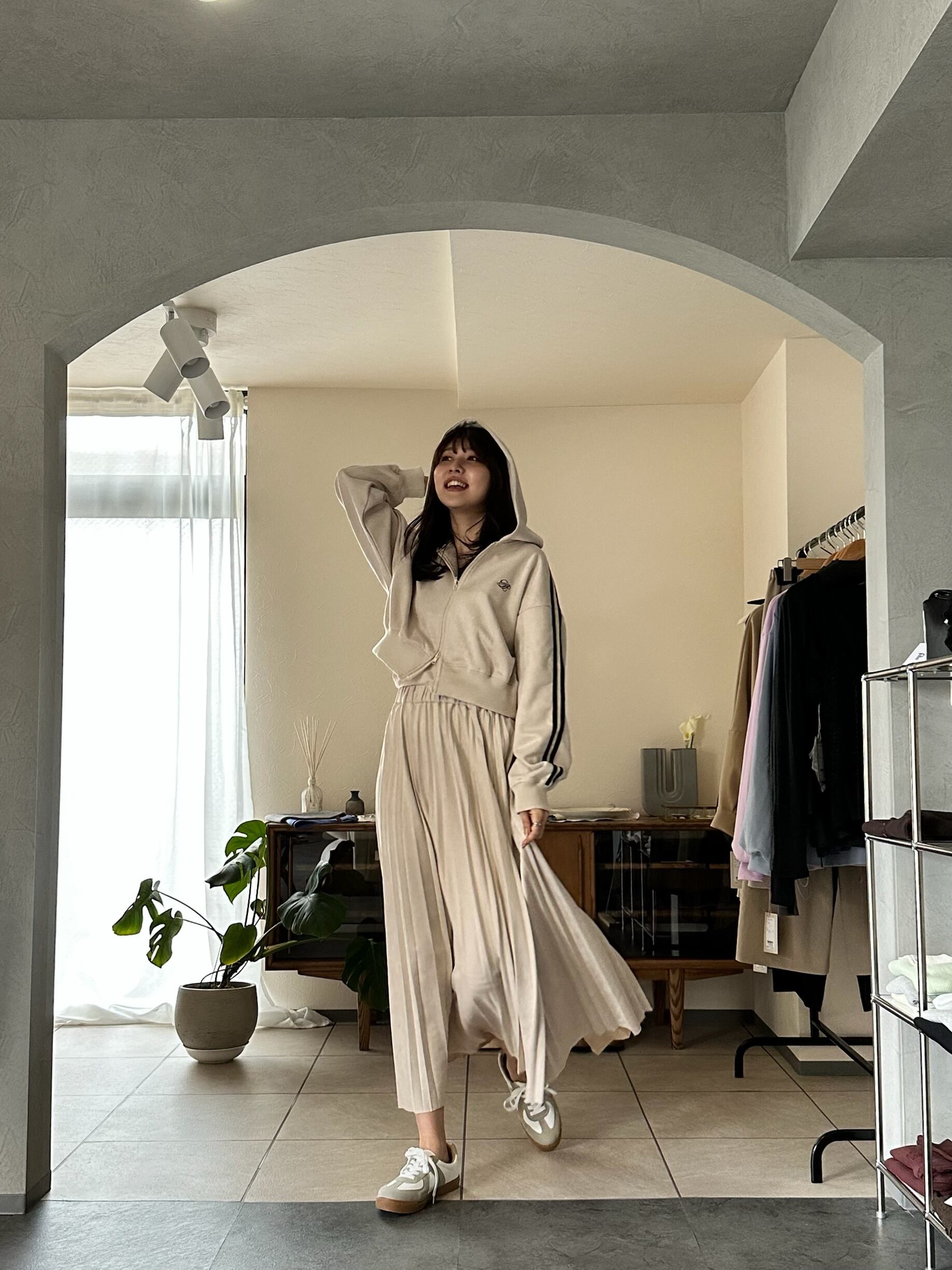 ・同素材のショート丈パーカーと合わせて、セットアップ風の着こなしに