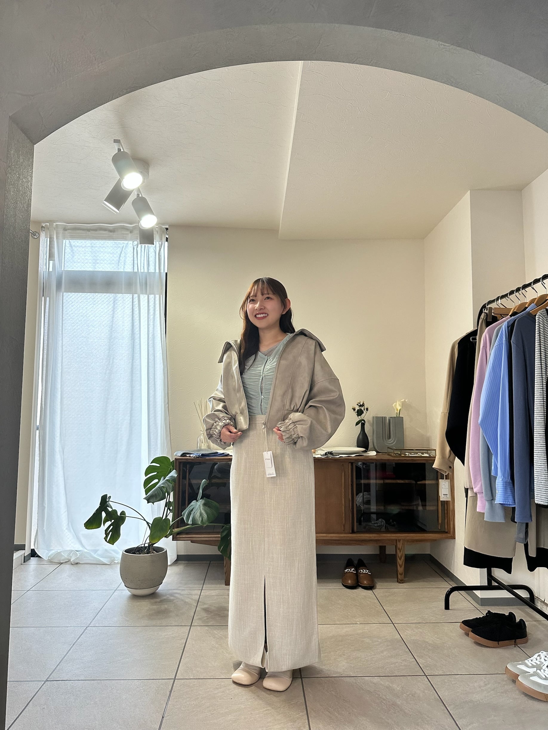 リネンのような風合いを感じる涼感素材で仕立てたスカートです。