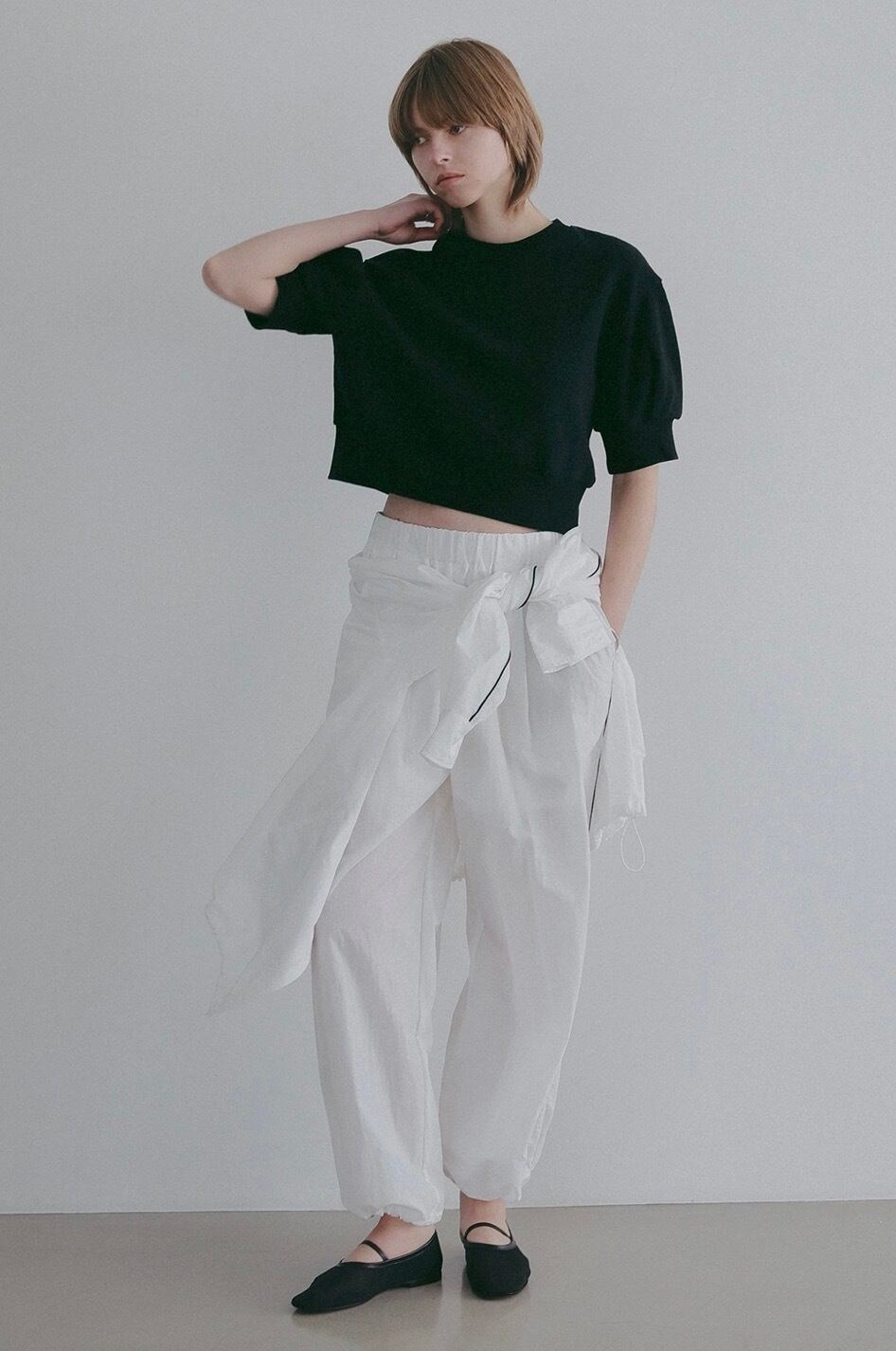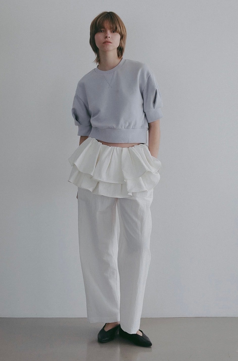 ヴィンテージのスウェットを基調に、ショート丈のパフスリーブで女性らしいディテールをプラスした一着。